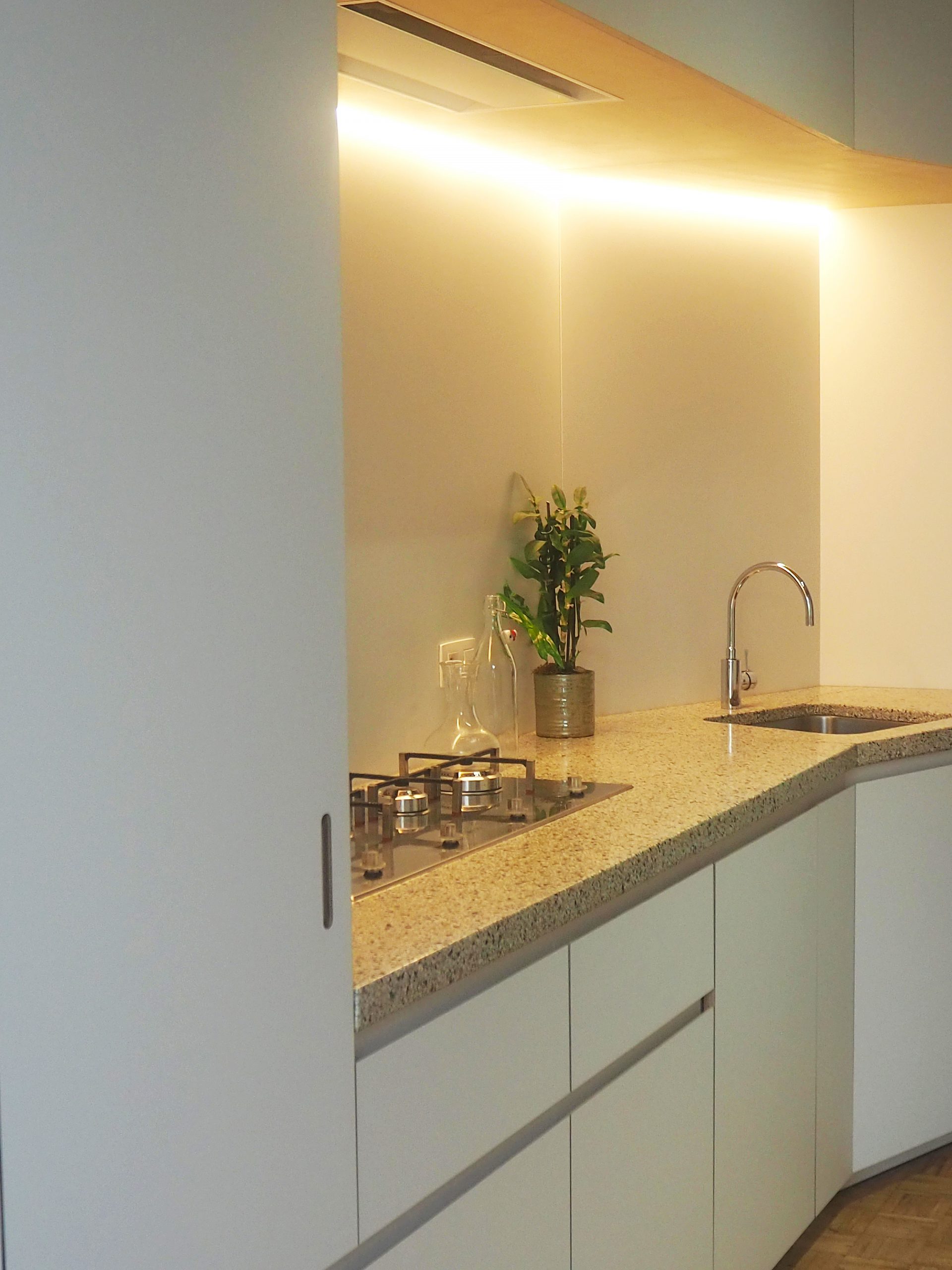 Een smalle rijwoning voorzien van alle comfort zonder in te boeten op ruimte: een uitdaging waarvoor de eigenaars een architect onder de arm namen. Die tekende een soort ‘blok’ in de ruimte, die de keuken vormt, wat zorgt voor een open zicht. Constructief ging aan de slag op aanwijzen van de architect en bouwde zowel de (letterlijke) keukenblok alsook de kastenwand in de leefruimte.